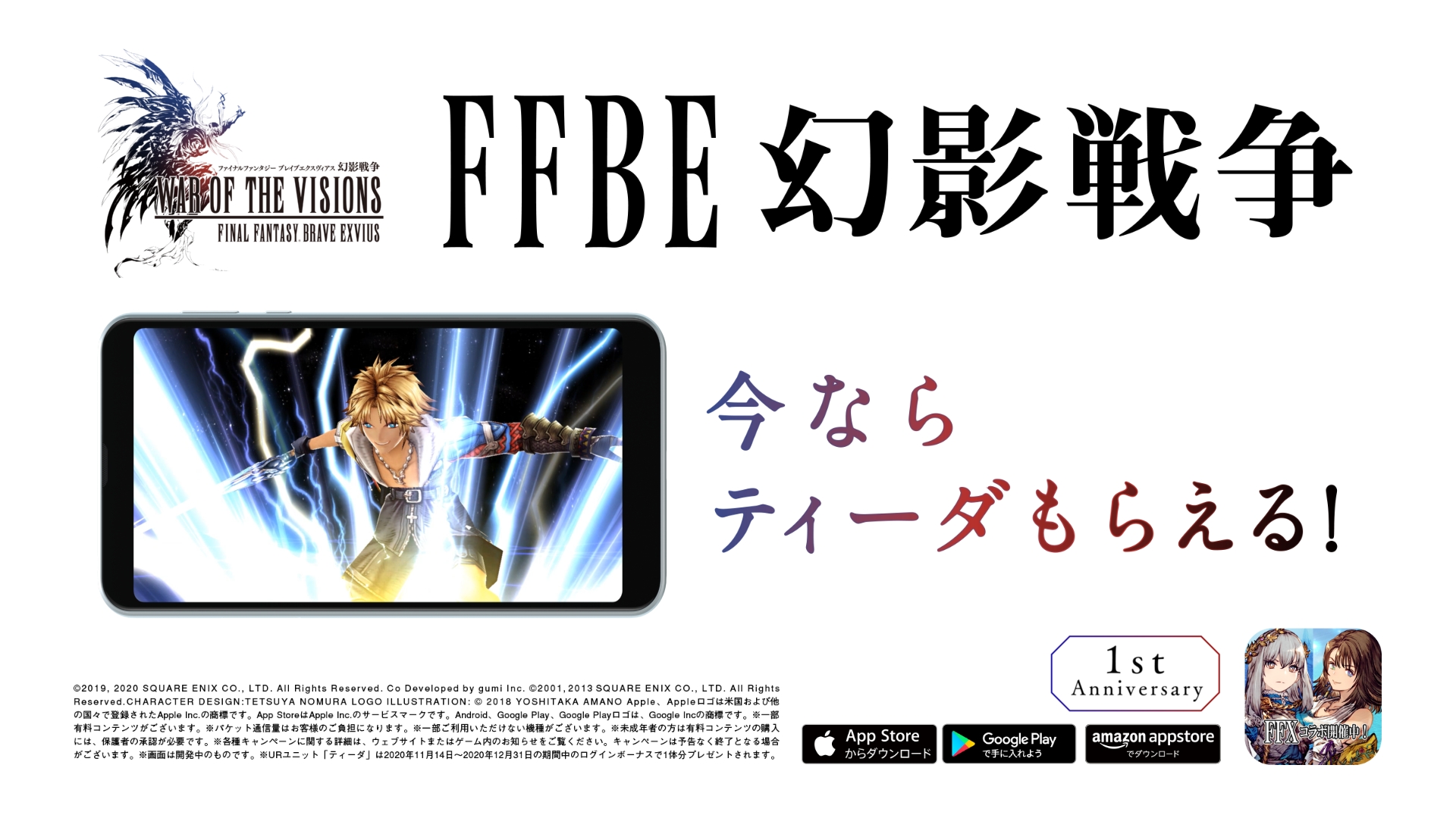 本日 11 月 14 日に一周年を迎えた 『FFBE 幻影戦争』は、『FINAL FANTASY X』とのコラボレーションを開始。人気キャラクターのティーダとユウナが参戦し、コラボイベントも開催中だ。また、今回のコラボレーションを記念して、プレイヤー全員にコラボキャラクターであるティーダを 1 体プレゼントする。