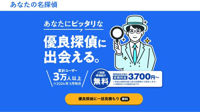 そんなお悩みを解決するのが、日本最大級の探偵比較・口コミサイト「あなたの名探偵」です。全国700件以上の探偵事務所の情報が集約されており、リアルな体験談や料金相場をもとに、信頼できる探偵を見つけられます。