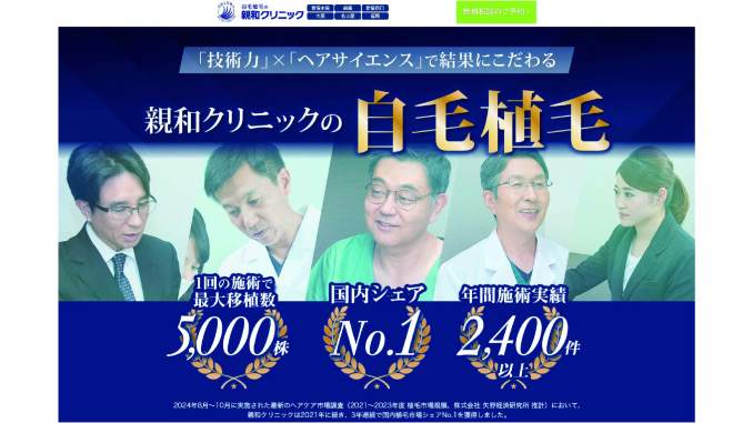 親和クリニックは、自毛植毛を専門としたクリニックで、全国に複数の院を展開しています(新宿院・銀座院・大阪院など)。主に男性の薄毛治療・自毛植毛に特化しており、最新技術「MIRAI法」による高密度植毛が可能です。