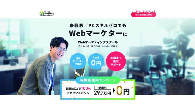**Global Marketing Academy(GMA)**は、未経験からWebマーケターを目指す方にとって最短ルートのひとつです。