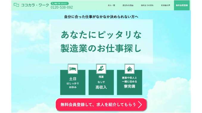 これらを一つひとつクリアできるサービスがあれば、安心して転職活動ができます。そんな中で「ココカラ・ワーク」は、製造業に特化した求人・サポートで知られており、「高収入」「寮完備」「未経験歓迎」といった条件に惹かれる人にすごく合っているサービスです。
