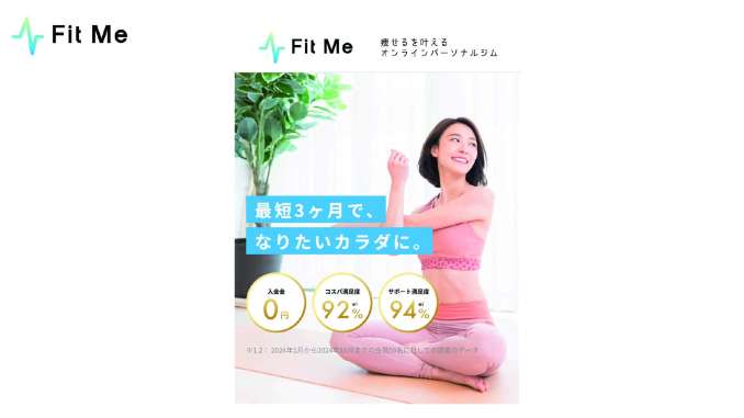 「Fit Me」は、自宅でプロのトレーナーによるマンツーマン指導を受けられるオンラインパーソナルジムです。専用のトレーニングキットや、食事・メンタルサポートを通じて、効率的なボディメイクを実現します。