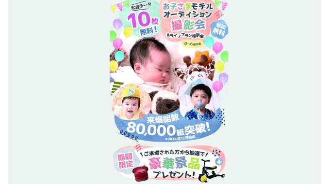 プロカメラマンによる無料撮影、5カットの写真データ、豪華プレゼント、さらに子育てに役立つライフプラン相談までセットになった“超お得なイベント”です。