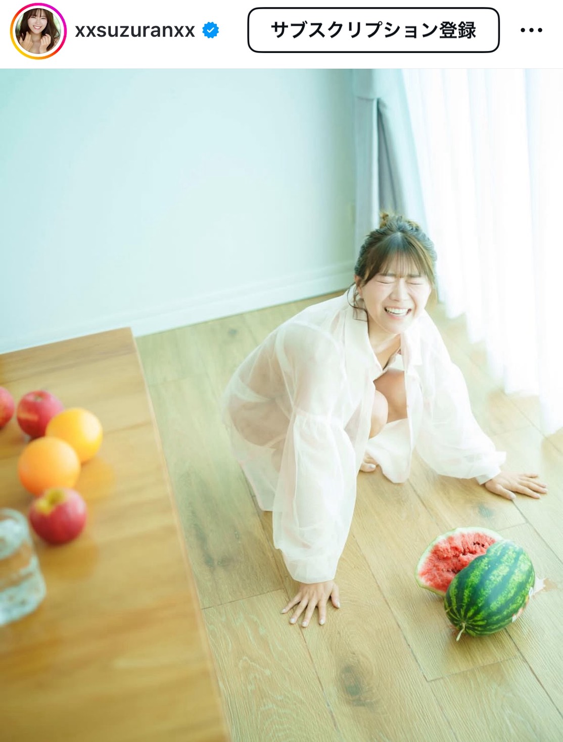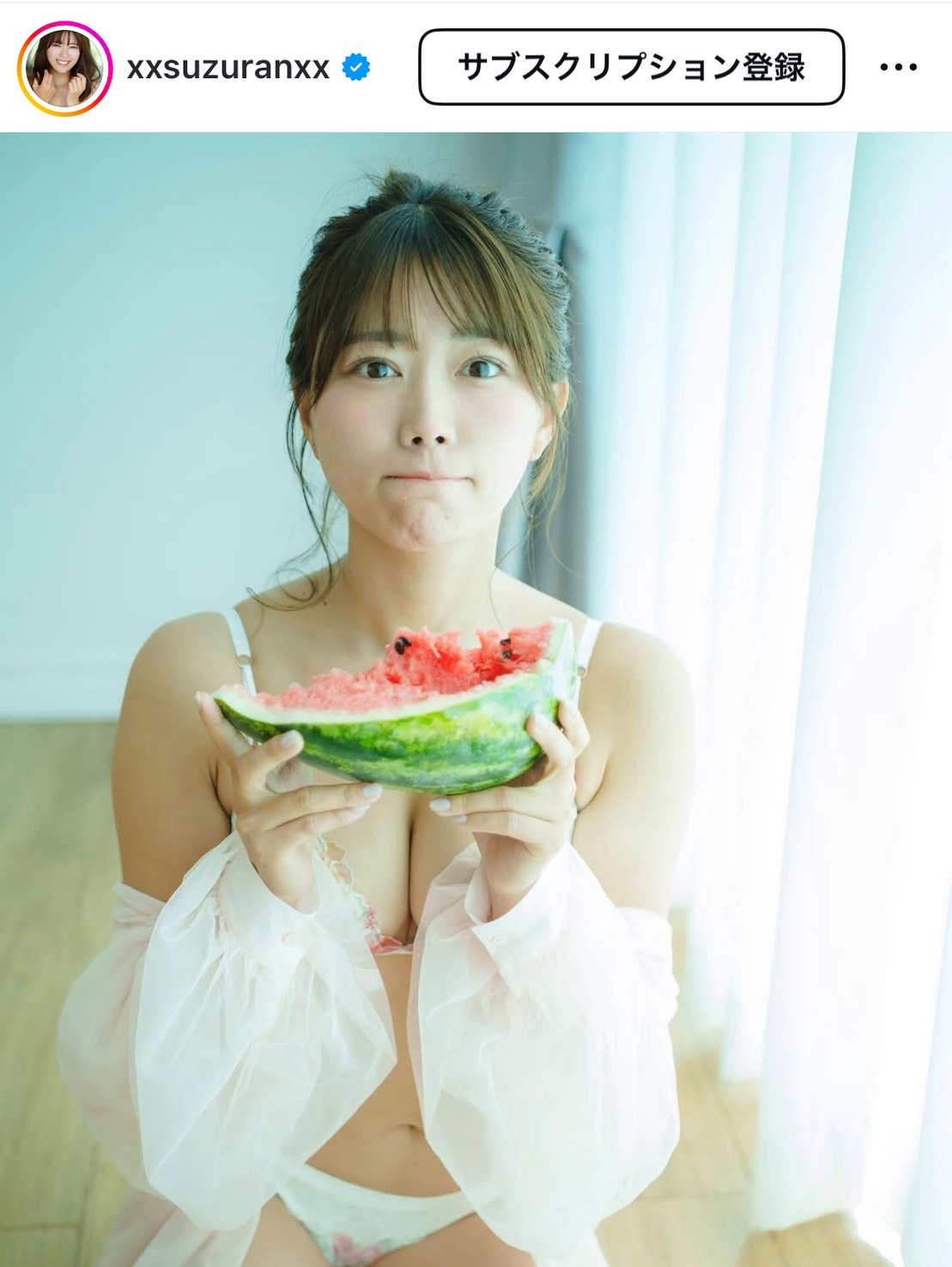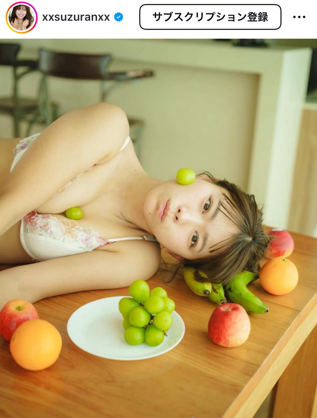 元アイドルでタレントの山内鈴蘭(30)が、自身のインスタグラムでセカンド写真集「おきにいり」の新カットを公開。テーブルに寝そべりながらランジェリー姿で南国フルーツを胸に挟む大胆カットや、スイカを頬張る写真などを披露し、ファンの間で「ブドウになりたい」などの反応が広がっている。