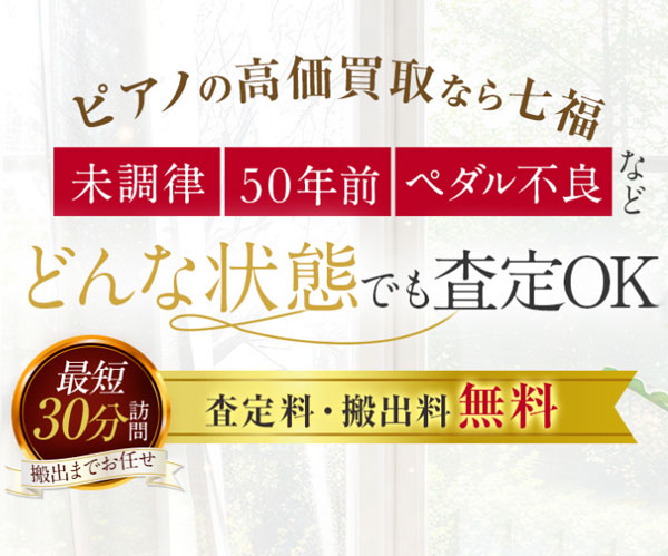 七福(しちふく)は、ピアノ買取の中でも“柔軟な査定”と“訪問のスピード”で評価されている買取業者です。「他社で断られた」「古くて状態が悪い」「運び出せるかわからない」…そんなピアノでも積極的に査定してくれるため、処分に困ったピアノを持っている方に非常に向いています。