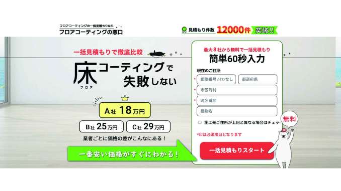 「フロアコーティングの窓口」は、フロアコーティング業者を最大8社まとめて比較できる無料の一括見積りサービスです。