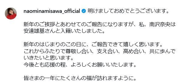 南沢は「明けましておめでとうございます」と新年のあいさつから書き出し、「新年のご挨拶とあわせてのご報告になりますが、私、南沢奈央は安達雄基さんと入籍いたしました」と結婚を報告。「新年のはじまりのこの日に、ご報告できて嬉しく思います」と心境を明かし、「これからふたりで尊敬し合い、支え合い、高め合い、共に歩んでいきたいと思います」と、夫婦としての決意をつづった。最後は「今後とも応援の程、よろしくお願いいたします」とファンへの感謝の言葉で締めくくっている。