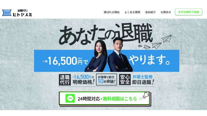退職代行ヒトヤスミは、16,500円(税込)という業界最安水準の料金で、会社と一切やり取りせずに退職できるサービスです。