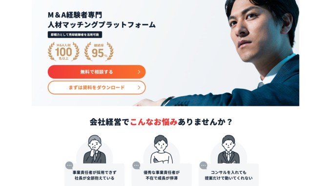 最大の特徴は、金融機関や戦略コンサル出身などの「ハイクラスなM&Aのプロ」が専任のパートナーとして伴走してくれる点。まずは無料で専門家に相談でき、自社の立ち位置や売却の可能性を客観的に知ることができます。