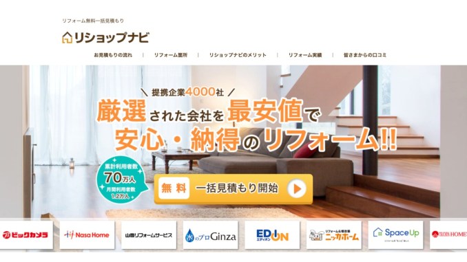リショップナビは、東証プライム上場企業の「株式会社じげん」が運営するリフォーム一括見積もりサービスです。全国4,000社以上の優良企業と提携しており、あなたの希望条件を入力するだけで、最大5社のぴったりなリフォーム会社を紹介してくれます。