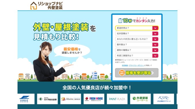 リショップナビとは別ブランドとして「外壁・屋根塗装」に特化しているため、塗装に強い専門業者が優先的に紹介されます。「リフォーム全般は詳しいが塗装は…」という業者ではなく、塗装のプロと出会えます。