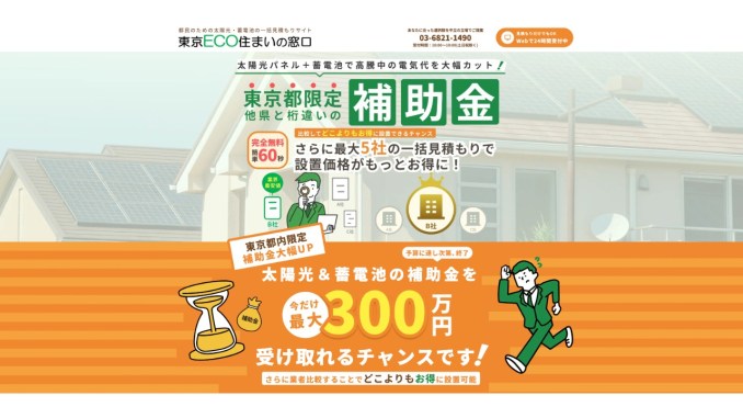 理由はシンプルで、東京都は全国で唯一、太陽光発電・蓄電池に対して桁違いの大型補助金を出している自治体だからです。 国・都・市区の補助金を組み合わせることで最大300万円もの支援が受けられる可能性があり、他の都道府県とは一線を画した優遇制度が存在します。 この補助金を最大限に活用するためのサポートに特化したのが、同サービスです。