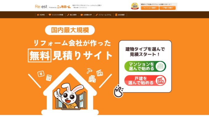 Re:est(リエスト)は、ニッカホーム株式会社が運営する「リフォームかんたん無料見積りサイト」です。「リフォームの費用が不透明でわかりにくい」という長年の業界課題を解決するために生まれたサービスで、個人情報を入力することなく、選ぶだけの操作でたった1分に概算見積もりが確認できるのが最大の特徴です。