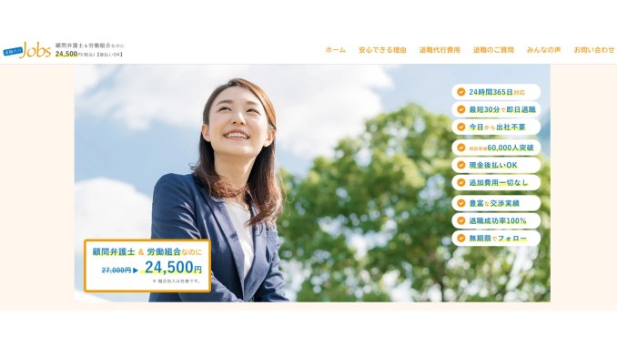 退職代行Jobs(ジョブズ)は、「顧問弁護士監修+労働組合連携」という二重の安心体制を持ちながら、27,000円(税込)という業界トップクラスのコスパで提供されている退職代行サービスです。
