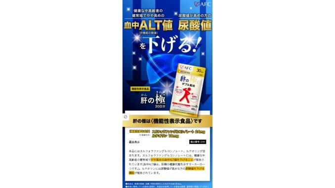 肝の極(かんのきわみ)は、静岡市に本社を置く株式会社エーエフシー(AFC)が販売する機能性表示食品のサプリメントです。