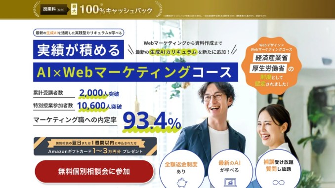 2021年の開校以来、受講者数は2,000名を突破(2025年8月時点)。マーケティング職への内定率93.4%という業界トップクラスの実績を誇り、経済産業省が推進するリスキリングを通じたキャリアアップ支援事業にも選定されています。